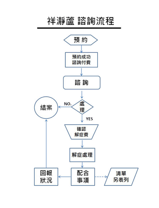 2. 化解:經諮詢找出問題癥結之後,有些會建議化解,有些人無須化解,另每個人的情況都不一樣,沒有固定的公式可以套用,收費也都要視個案而定,應先詢問清楚,是否需要化解處理由當事者決定。有不了解,都可再三詳細詢問,不可口出惡言,造口業,否則後過自負。
